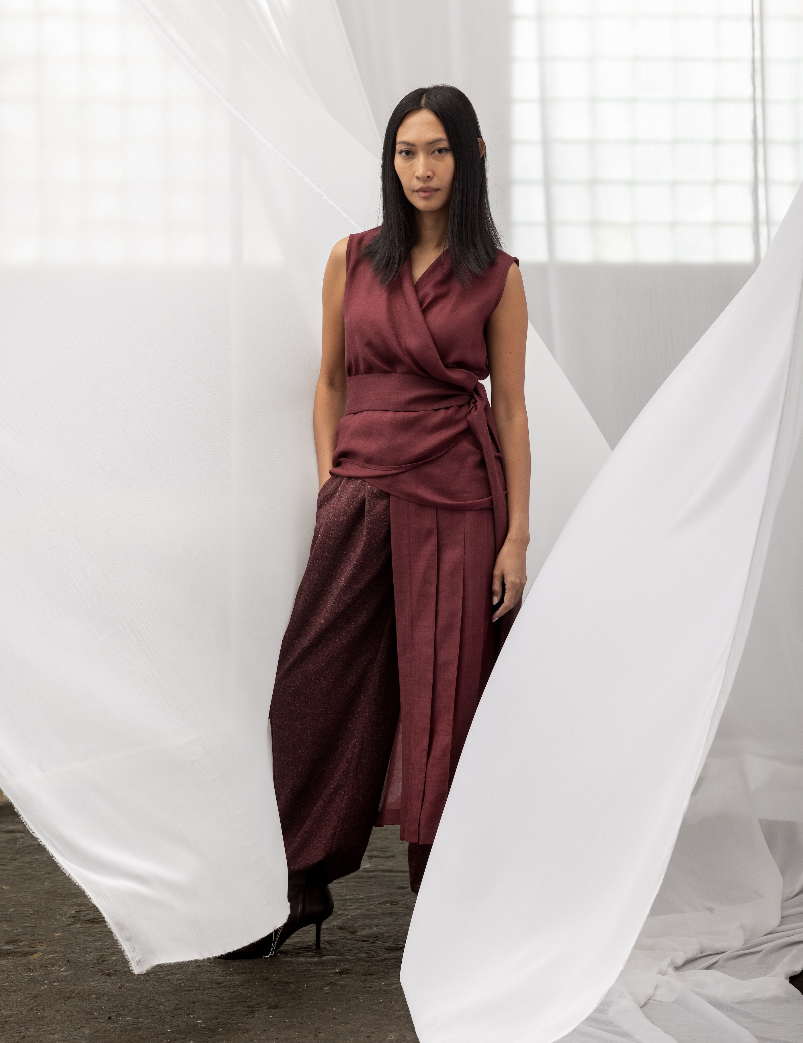 INKERI Sheer Wool Wrap Blouse - Burgundy